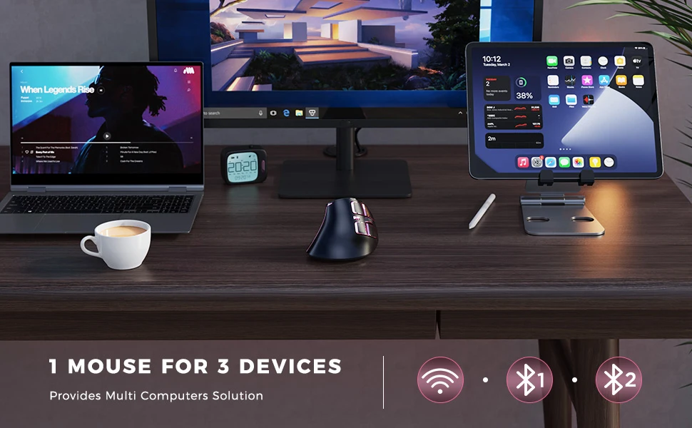 There are three ways to connect the vertical mouse: Bluetooth 3.0, Bluetooth 5.0 and USB receiver. You can use a different device for each connection mode. 1 click for switch from the devices easily